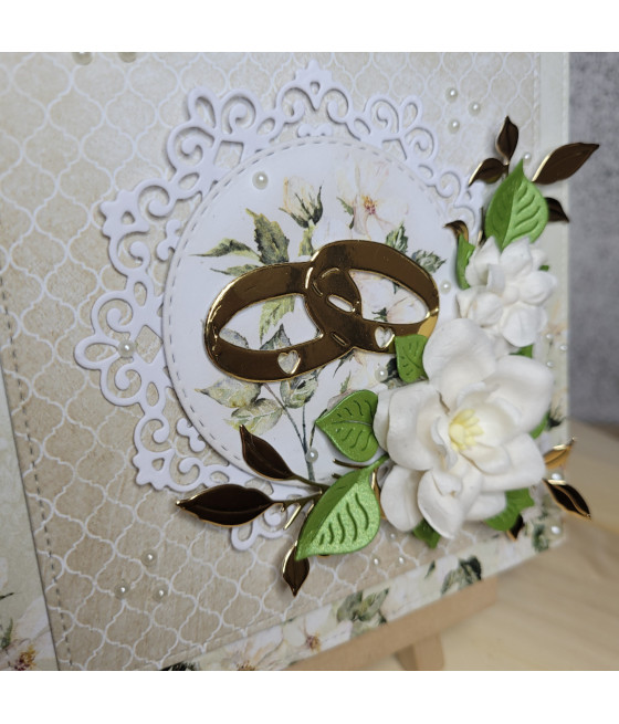 Z przodu grafika kieliszków z kremowymi różami z papieru, zielonymi listkami, perełkami i złotymi serduszkami.