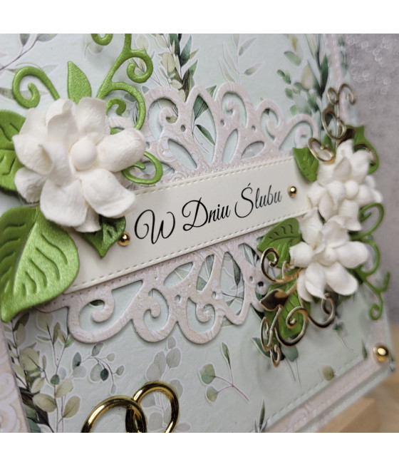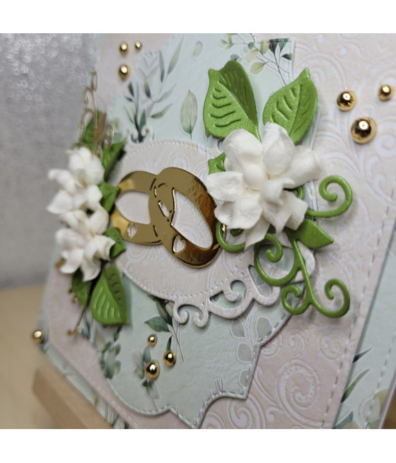 Z przodu zielone tło, złote listki, obrączki, serca i zawijaski, złota trzydziestka, napis Rocznica Ślubu oraz kremowe kwiaty.