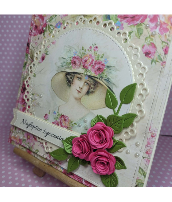 Z przodu warstwowe tło w kwiaty, owalna ozdobna, perłowa serwetka, grafika damy w kapeluszu, różowe różyczki z papieru, zielone listki, perłowe kropelki oraz napis Wszystkiego najlepszego.