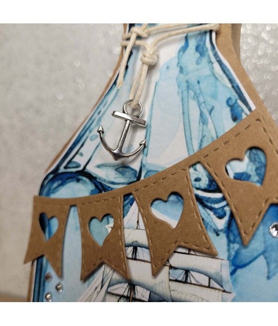 Niebieska, marynistyczna kartka w kształcie butelki.