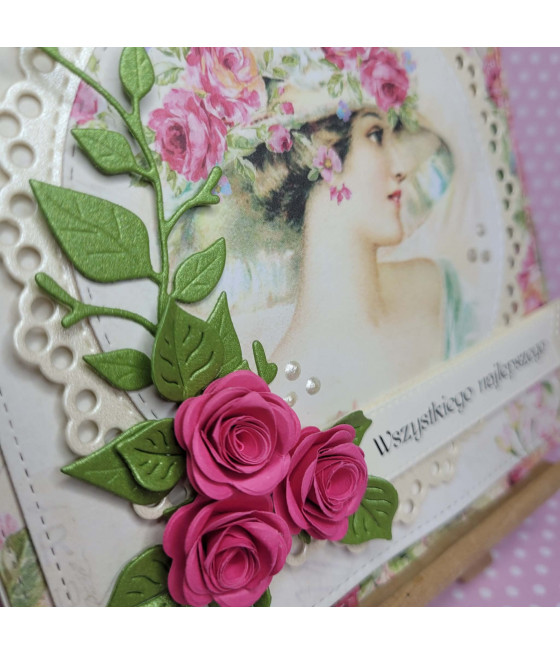 Z przodu grafika balonu, różowy banerek, cyrkonie, różowe kwiatki na zielonych listkach, chmurki i napis W dniu Urodzin.